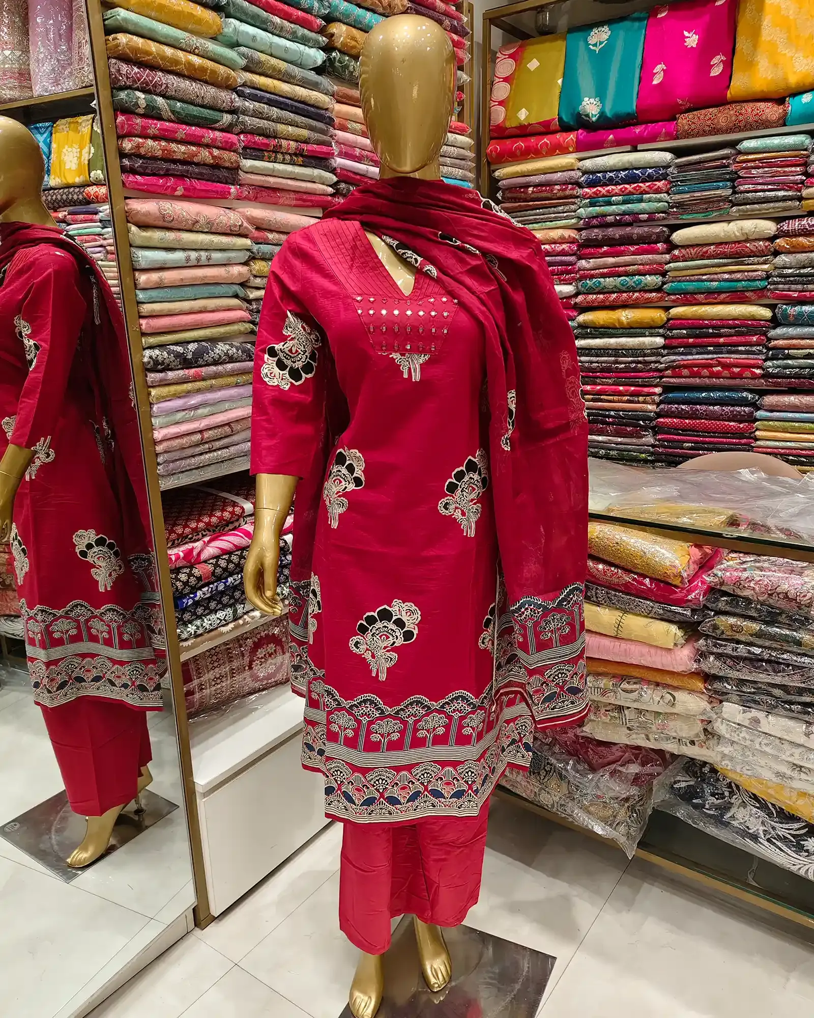 This Ethnic maroon cotton printed kurta pant set with dupatta featuring a floral printed kurta in black and cream color with an A-line pattern and V-neck embroidery. This ethnic maroon cotton printed kurta pant set is paired with a plain pure cotton pant and a long printed dupatta.