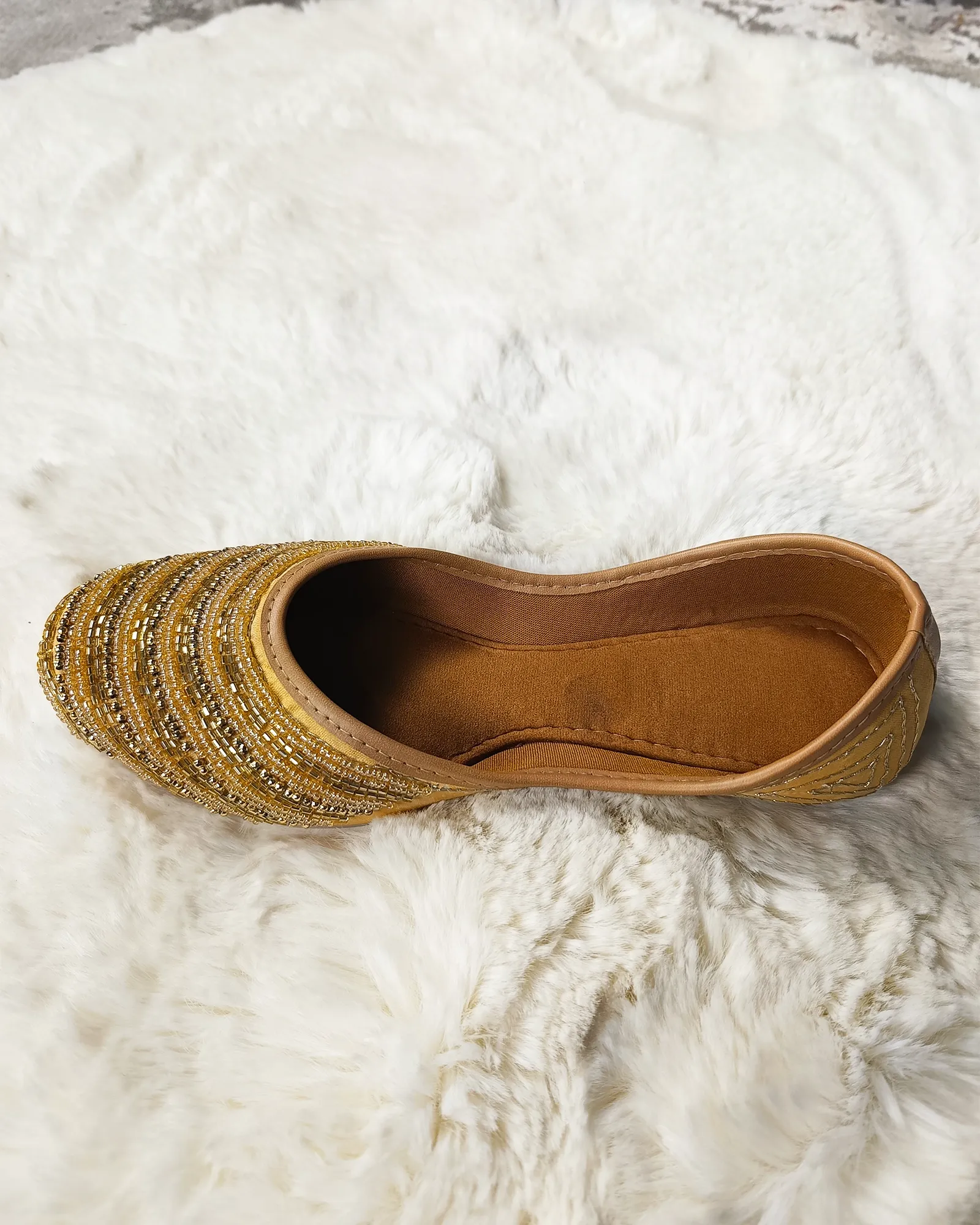 These rust-colored juttis with stone work and embroidery strike a perfect balance between elegance and tradition, making them a must-have accessory for any wardrobe.